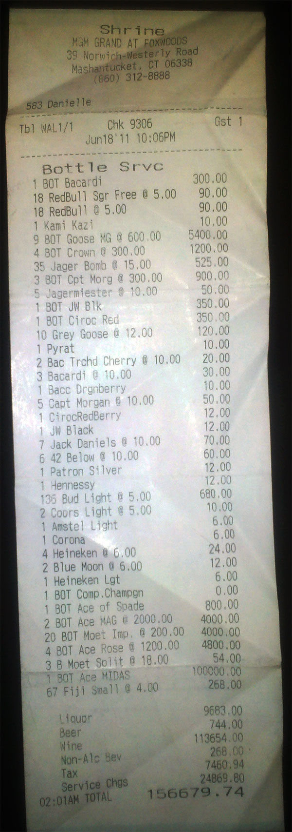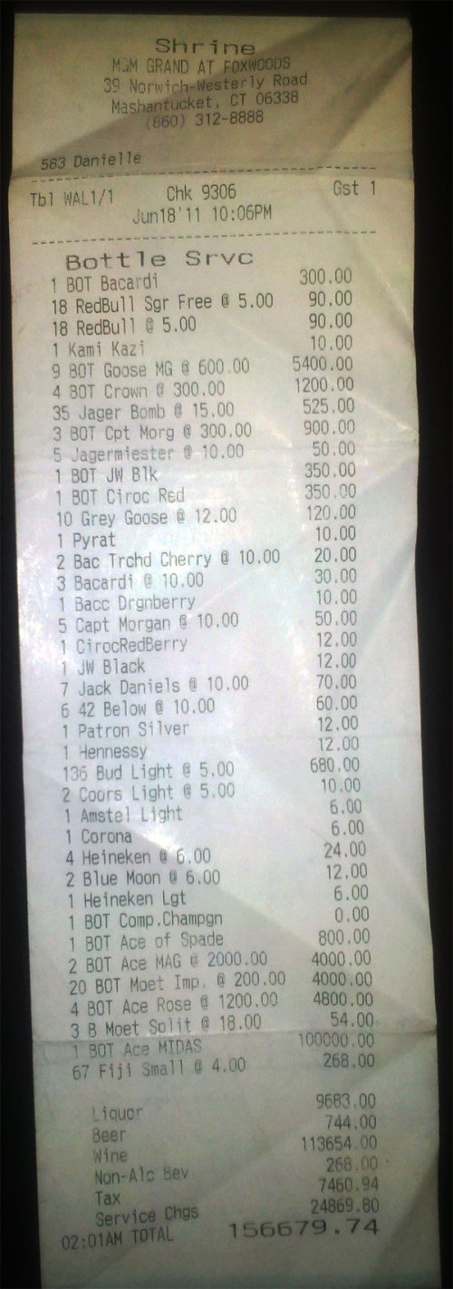 What?! No boneless buffalo bites? Here is the receipt for the Bruins’ bar tab after winning the Stanley Cup. The total is $156,679.74. Danielle was the server. If she was tipped the standard 20%, she walked with more than $31,000. I wonder if she had to share? Also, who’s the Sally who ordered the Amstel Light? (via 22 Words)