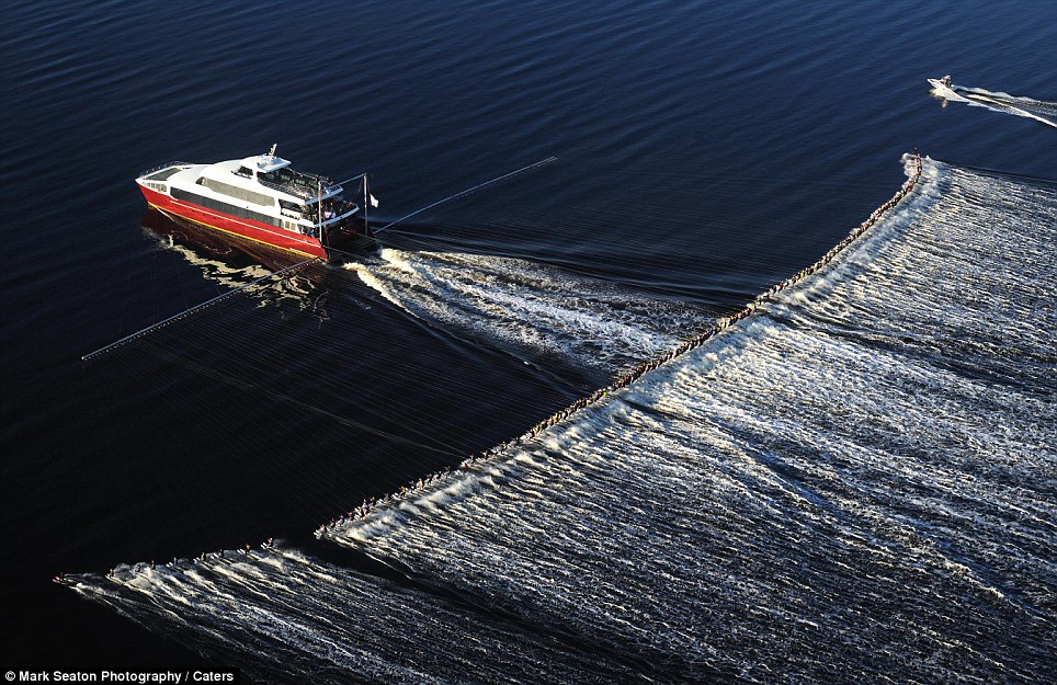 Leaving everyone in their wake: Waterskiers set new world record as 145 people are pulled behind a single boat. Full story. Did you know that water skiing was invented in Minnesota? True story.