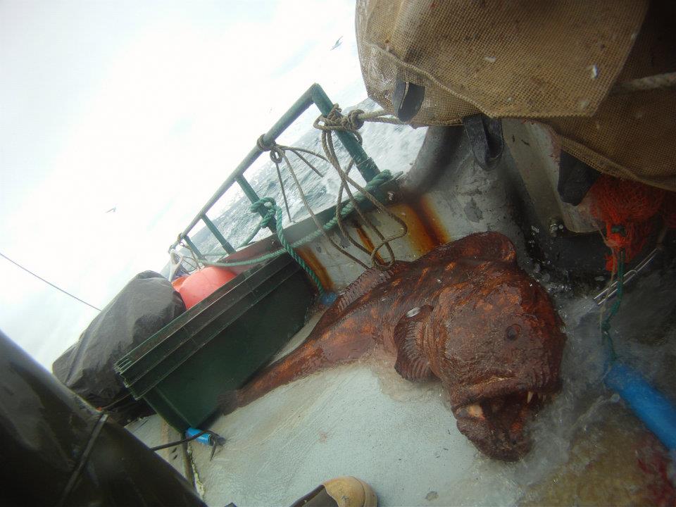 This is a giant Wolf Eel (approx 45 lbs) caught from a fishing boat in Alaska. Large wolf eels are curious and friendly and are rarely aggressive but are capable of inflicting painful bites on humans. This one reminds me of the movie Tremors.