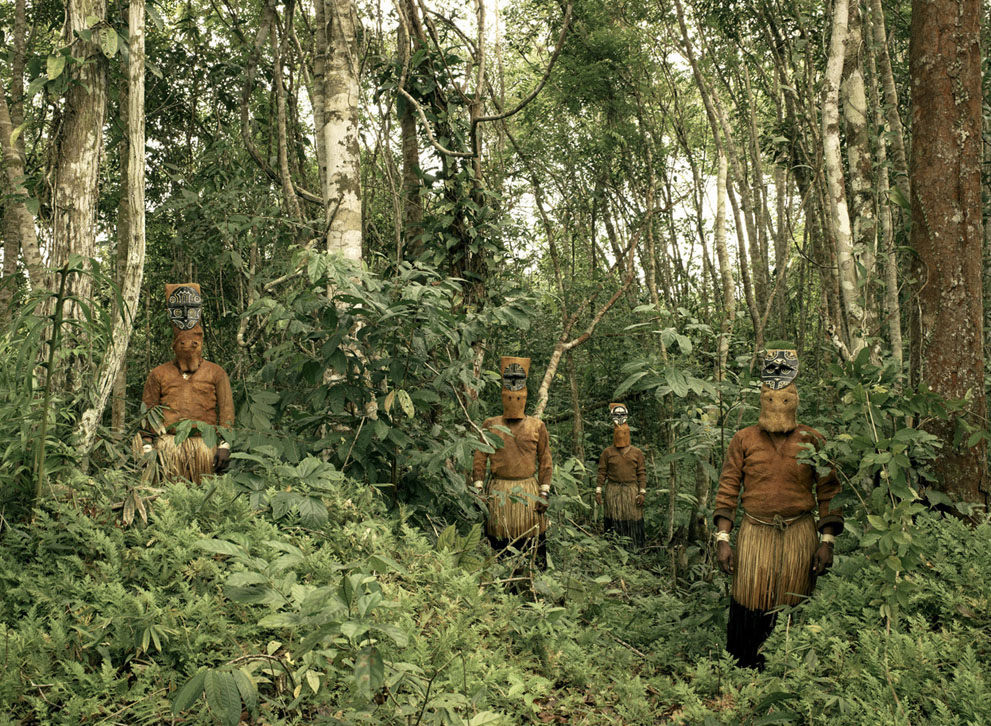 Guardians of the Forest: Deep in the Colombian Amazon, Yucuna indians stand dressed in traditional tribal attire for the Baile del Muñeco, or puppet dance, a celebration of the abundance of the Chontaduro fruit. While traditional indigenous customs are fast being lost throughout the Amazon jungle, here, far down the Caqueta river and few miles from the Brazilian border, traditions are still very much intact. The costumes are still made entirely from natural materials, predominantly tree bark, during this three day festival. (© Piers Calvert/National Geographic Photo Contest)