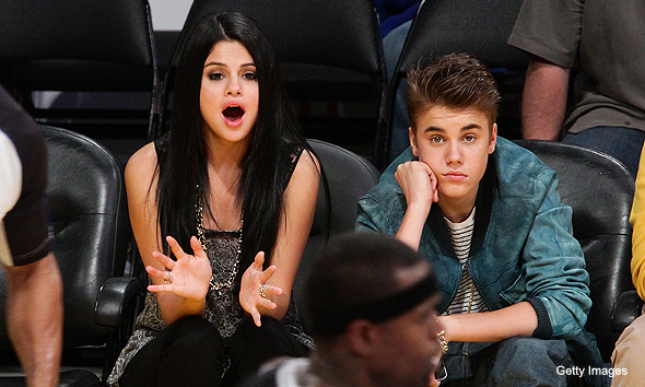 Justin Bieber and Selena Gomez at a Lakers-Spurs game.