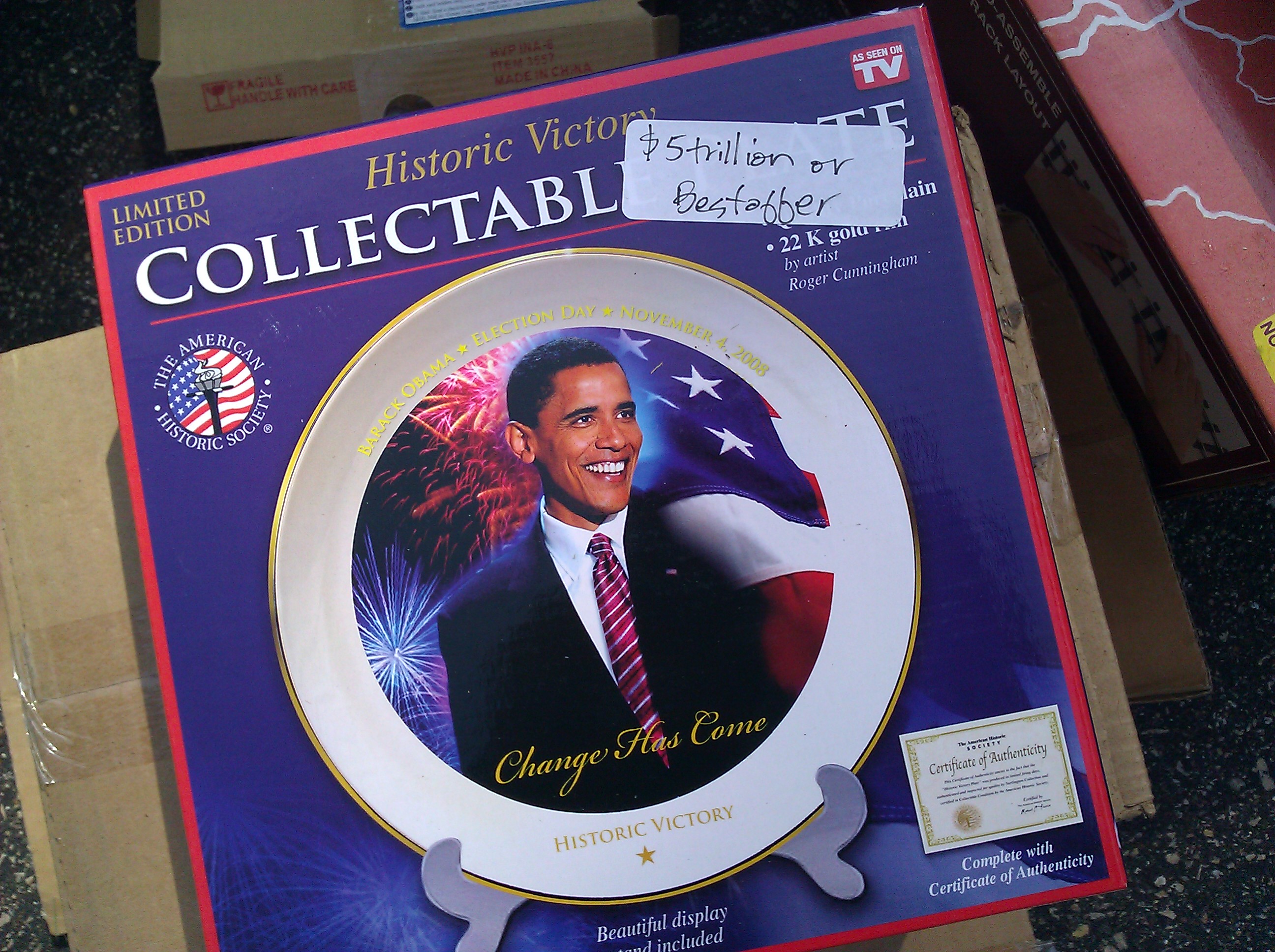 Tagged $5 Trillion or Best Offer, debt ceiling, Garage sale, Obama, Obama collectible plate, Politics & Religion, U.S. Debt