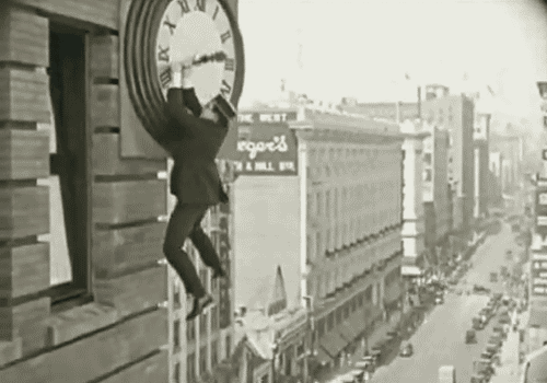 “During the famous clock tower stunt, Harold Lloyd is not as far from the ground as he appears. The building on which he climbs was actually a fake wall constructed on the roof of an actual skyscraper and skillfully photographed to maintain the illusion.” – IMDB