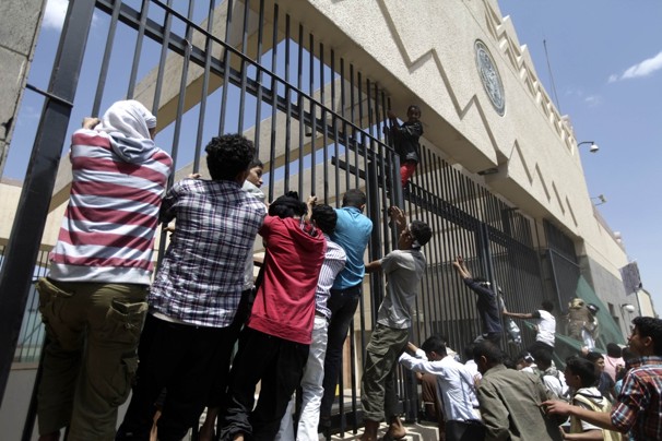 Hundreds of protesters chanting “Death to America” stormed the U.S. Embassy compound in Sanna, Yemen on Thursday. The protesters then burned the U.S. flag.