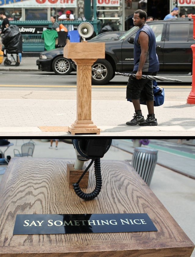 Improv Everywhere constructed a custom wooden lectern with a megaphone holster and an attached sign that read, “Say Something Nice.” The lectern was placed in public spaces around New York and then left alone. They wanted to see what would happen if New Yorkers were given the opportunity to amplify their voices to “say something nice.”