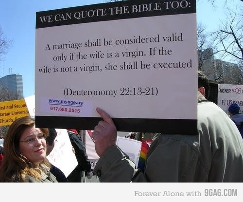 Settle down! I’m not advocating one way or another on the subject of gay marriage. This picture shows that quoting the Bible to back your cause can be a double-edged sword. Is Old Testament law relevant today? (via 9GAG)